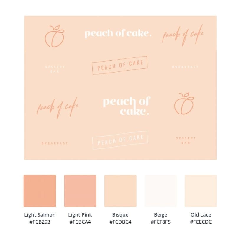 Desain branding ini menggunakan hampir semua variasi warna peach yang bisa dibayangkan. Meskipun terlalu banyak warna pastel terkadang bisa terasa berlebihan, variasi yang cukup dalam nuansa peach ini berhasil menciptakan kontras dan daya tarik visual.