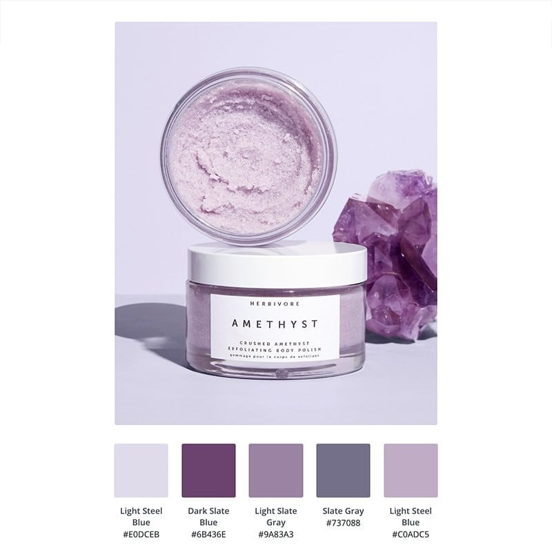 Kedalaman pada foto produk utama Amethyst Exfoliation Body Polish dari Herbivore Botanicals berasal dari variasi nuansa ungu, mulai dari warna pastel paling pucat hingga warna yang lebih pekat dan jenuh.