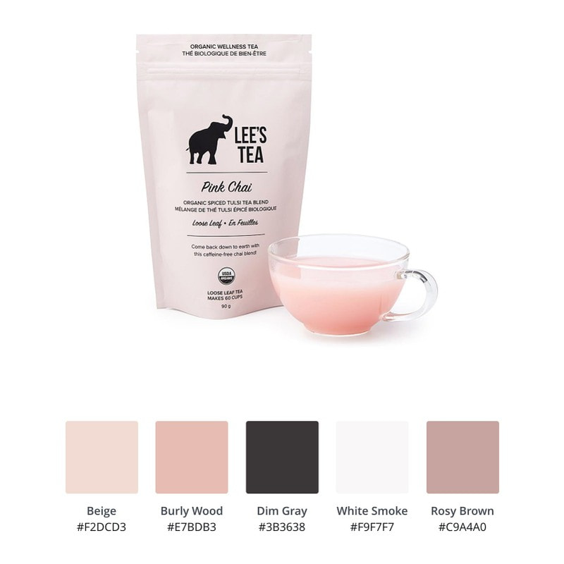 Warna pink pucat pada kemasan Teh Pink Chai dari Lee’s Tee memberikan nuansa yang menenangkan, sangat cocok dengan produk teh di dalamnya. Palet warnanya sederhana, membiarkan warna pink pastel dan tulisan hitam yang kontras menjadi pusat perhatian.