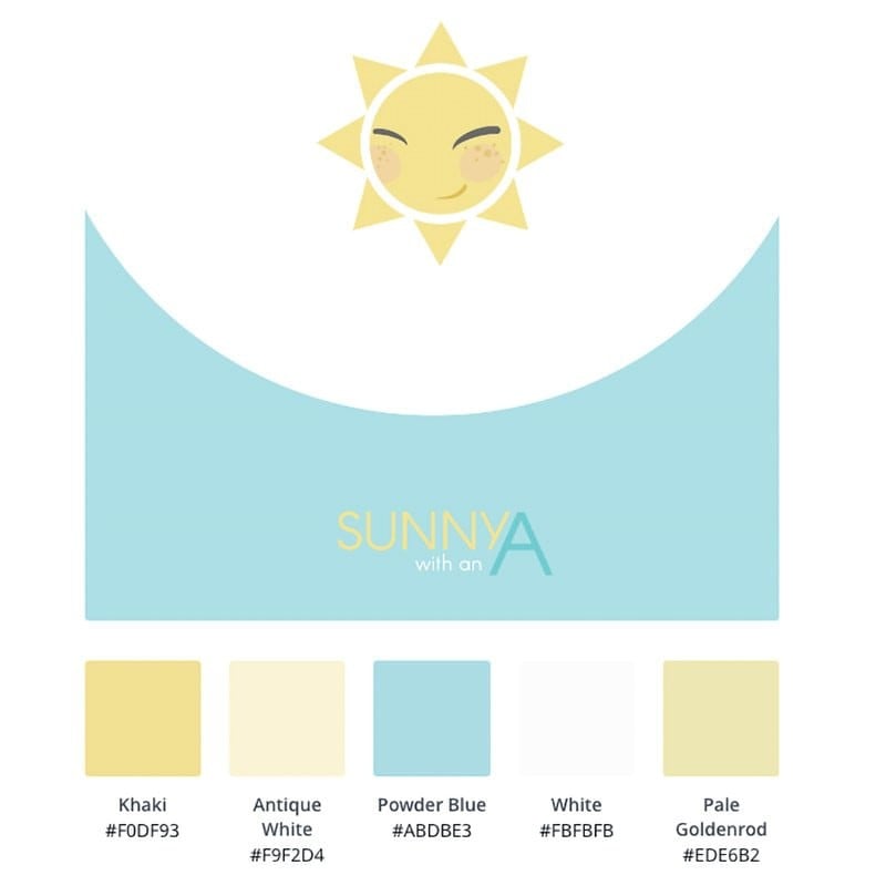 Salah satu cara kunci untuk mencampur warna pastel adalah dengan memadukan nuansa yang lebih lembut dengan yang lebih cerah. Warna powder blue pada logo SunnyA, yang lebih jenuh dibandingkan palet lainnya, membuat font berwarna kuning lembut menjadi lebih menonjol.