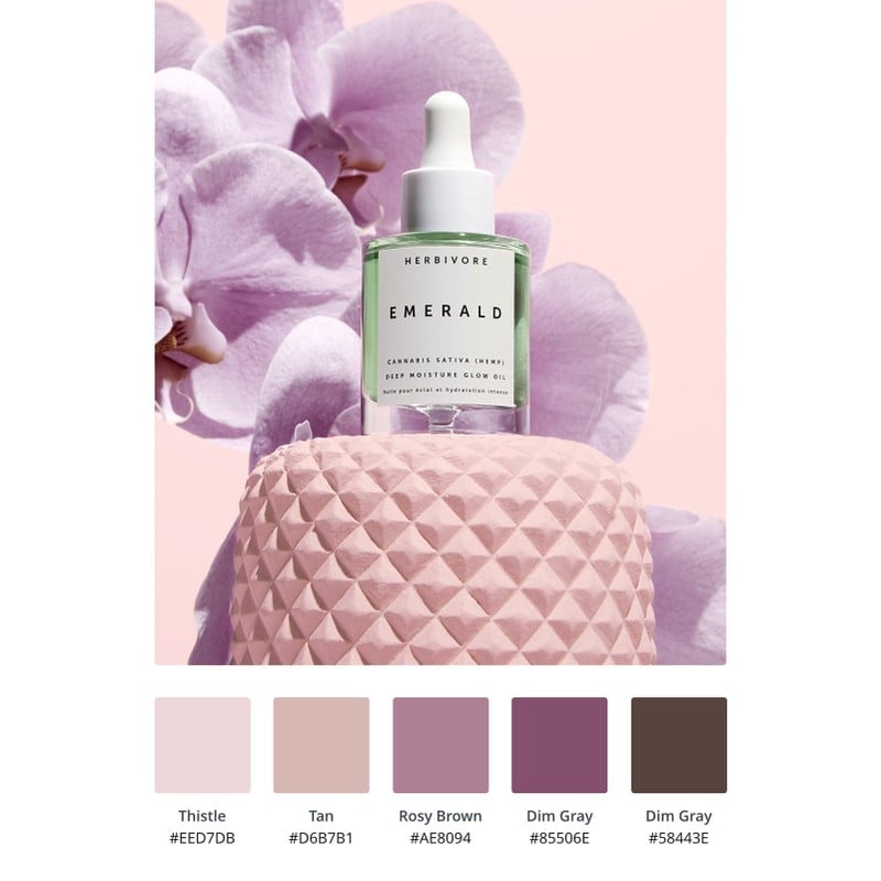 Foto produk Herbivore Botanicals Emerald Deep Moisture Glow Oil ini menggunakan berbagai nuansa pink pastel untuk melengkapi desain kemasan produk yang netral secara lembut.