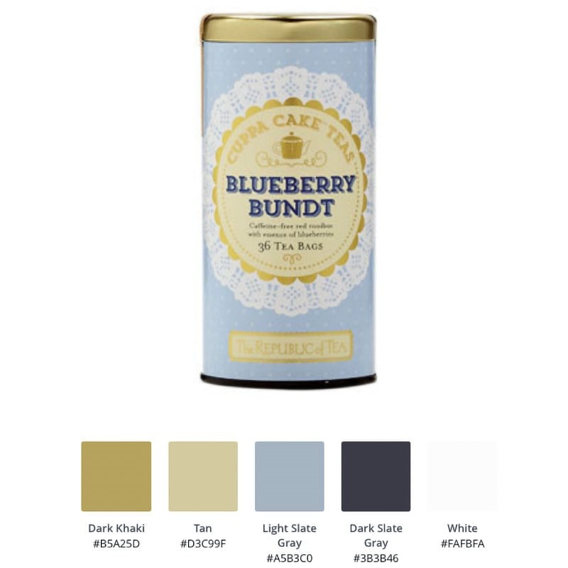 Biru pastel dipadukan dengan sentuhan cerah dari emas, kuning, dan putih dalam desain kemasan Blueberry Bundt dari Cuppa Cake Tea. Kombinasi ini menciptakan palet yang ceria dan menonjol di rak toko.