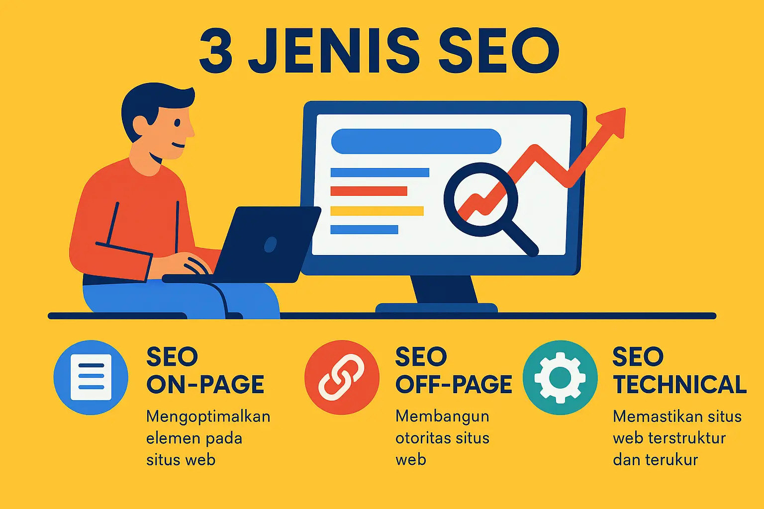 SEO terdiri dari tiga jenis, yakni SEO on-page, off-page, dan technical.