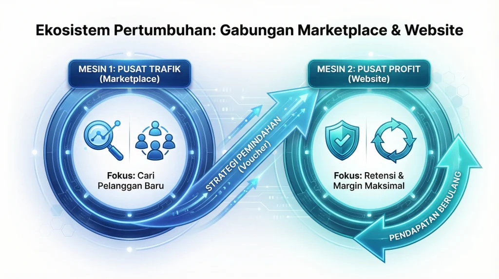 Klien sering bertanya kepada kami mengenai pilihan saluran penjualan utama: fokus pada Marketplace yang memiliki trafik tinggi, atau membangun website sendiri untuk menjaga margin keuntungan.