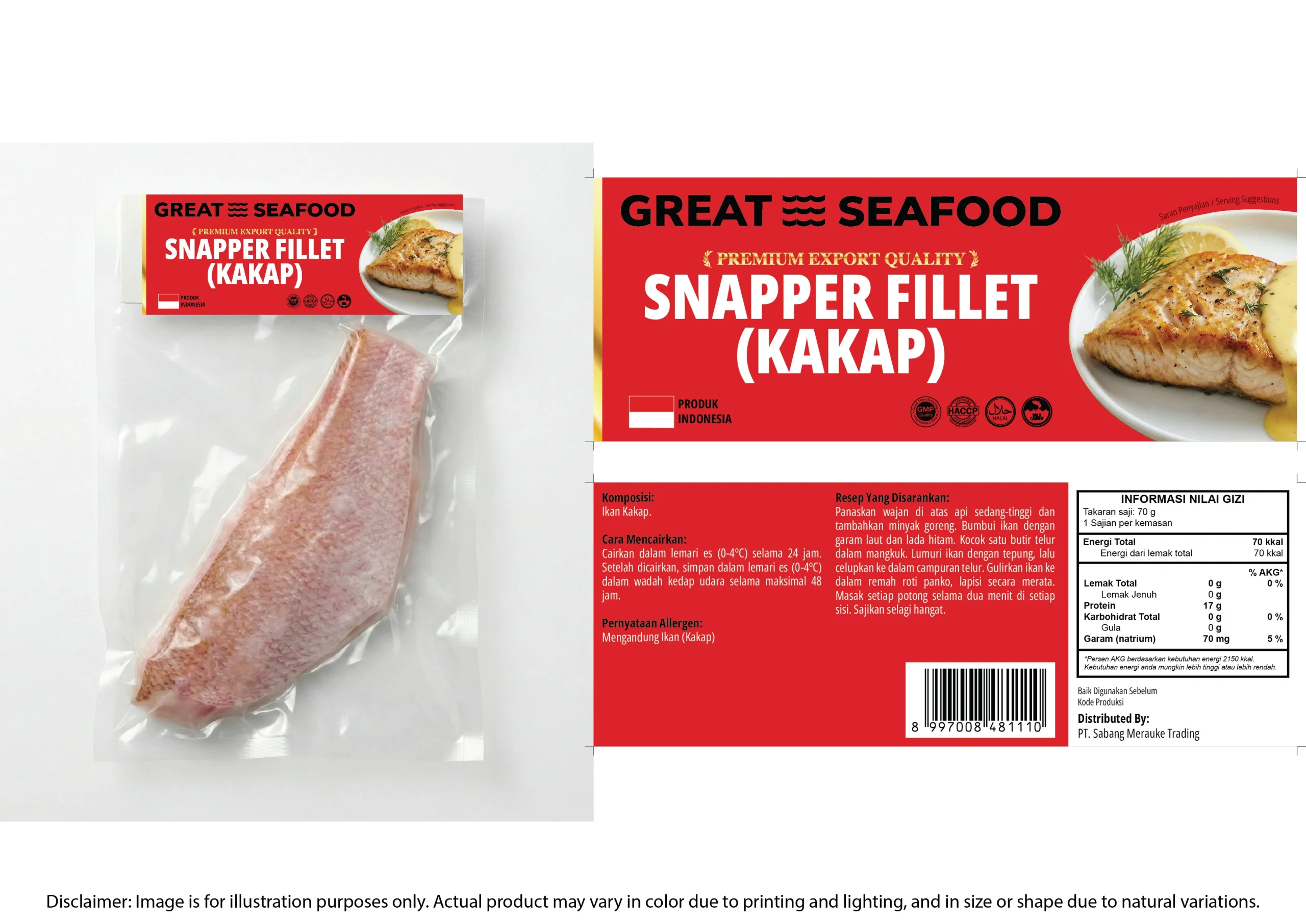 Tantangan terbesar menjual ikan fillet beku adalah wujud aslinya yang sering kali terlihat pucat dan kurang menarik saat dikemas dalam plastik vakum. Untuk menyiasatinya, kami menempatkan foto serving suggestion (saran penyajian) berupa kakap panggang berbumbu tepat di area depan kemasan. Strategi ini memindahkan fokus pembeli dari wujud ikan mentah ke potensi hidangan lezat yang bisa mereka buat. Di saat yang sama, sisa kemasan tetap dibiarkan transparan sebagai bentuk kejujuran produk, memberi keleluasaan bagi pembeli untuk memeriksa langsung ukuran porsi dan kesegaran daging ikan sebelum benar-benar membeli.