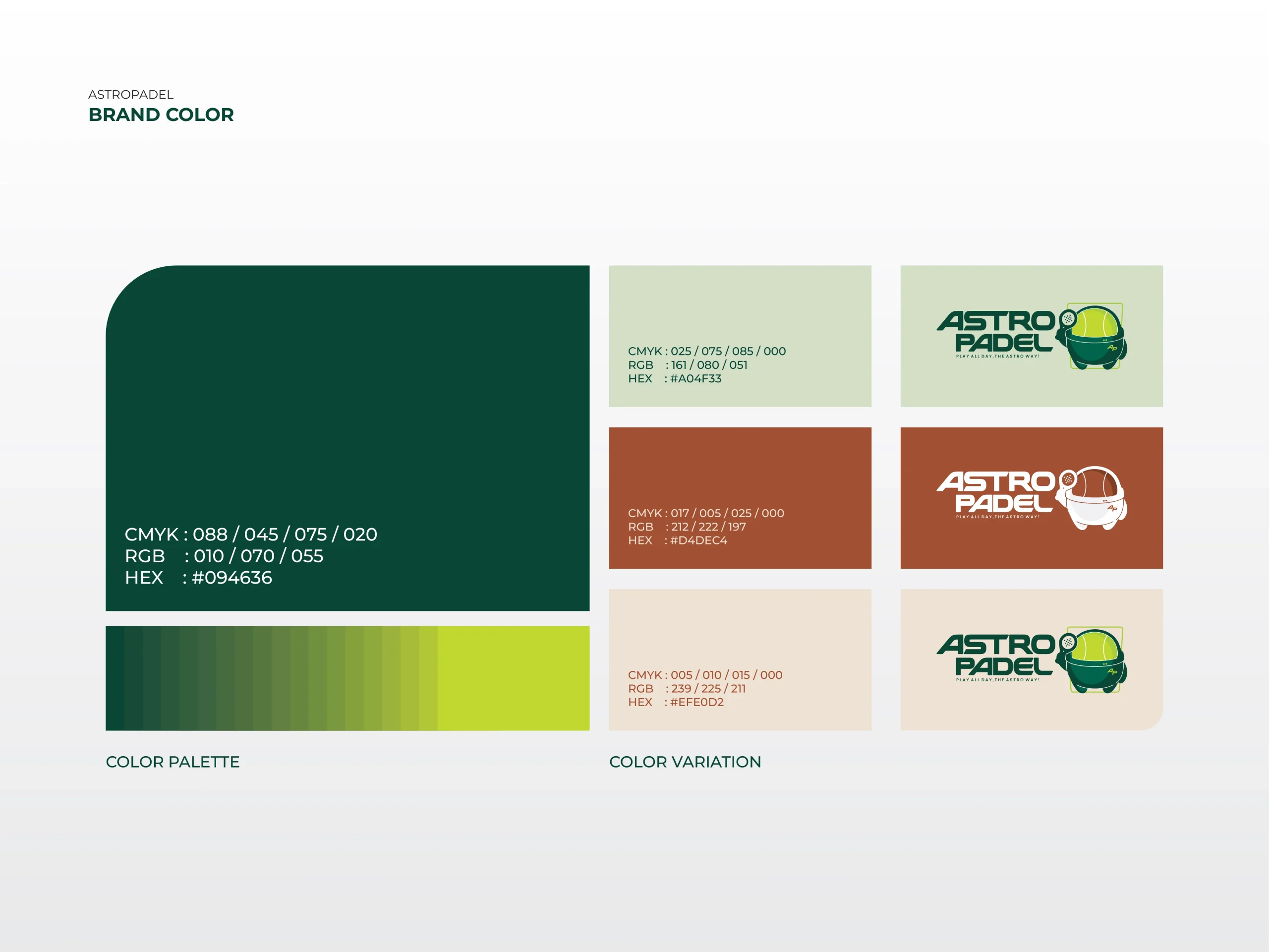 Kami menghindari warna neon terang yang sering dipakai fasilitas olahraga lain. Kami menggunakan warna hijau gelap untuk memberikan kesan eksklusif. Warna ini digabungkan dengan hijau limau yang menyerupai warna bola padel, serta sedikit warna krem dan cokelat agar logo menyatu dengan desain interior bangunan klien.