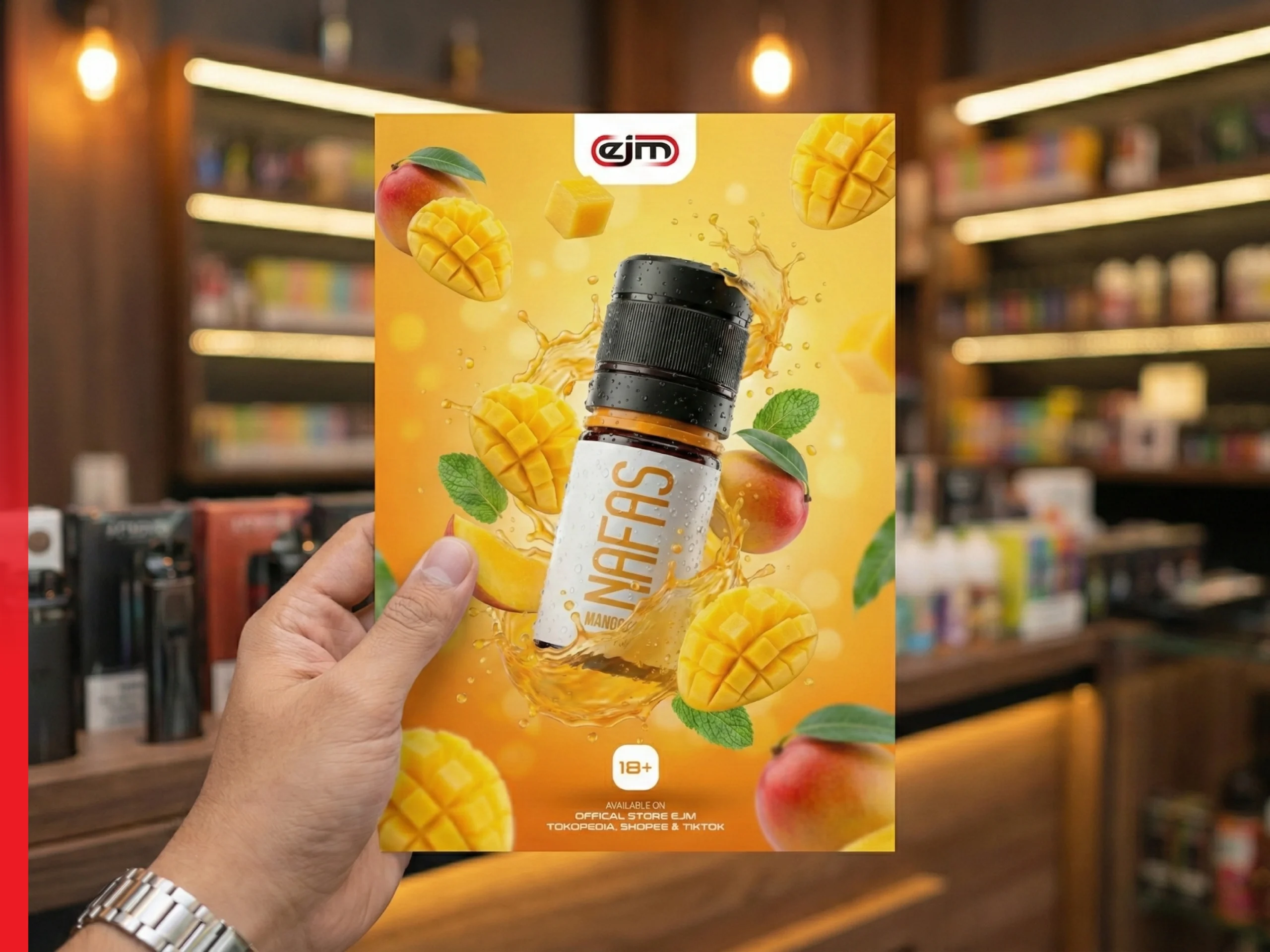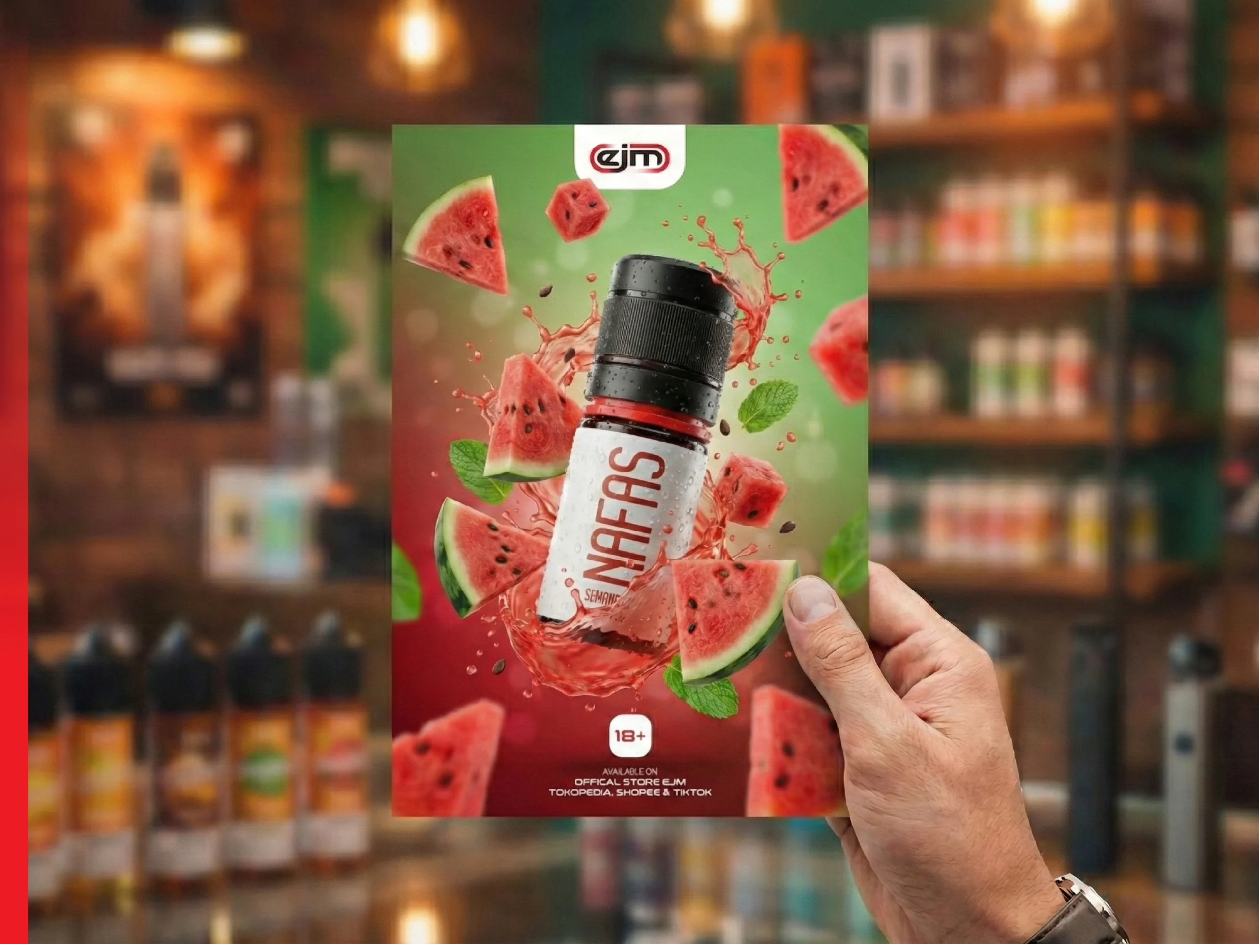 Untuk mempromosikan produk liquid varian Semangka dan Mangga, kami memajang foto potongan buah asli dengan efek cipratan air. Kami ingin pelanggan bisa langsung membayangkan rasa segarnya hanya dari melihat gambar. Ukuran poster dibuat memanjang ke bawah (vertikal) agar pas dipasang di rak toko dan bisa langsung dipakai untuk foto jualan di toko online seperti Shopee atau Tokopedia.